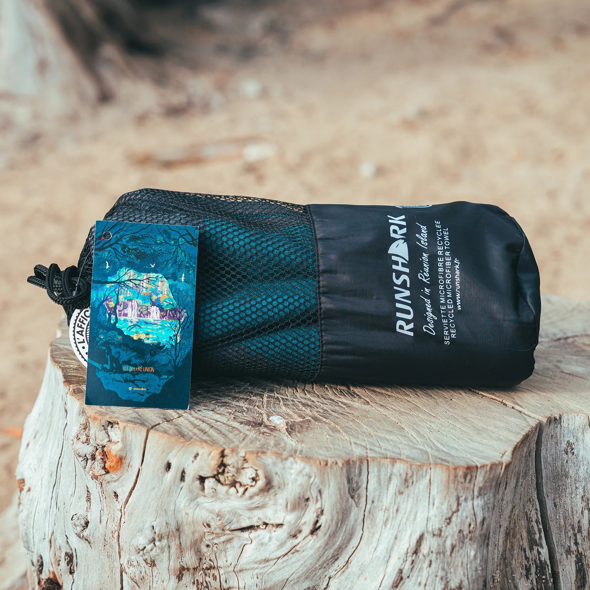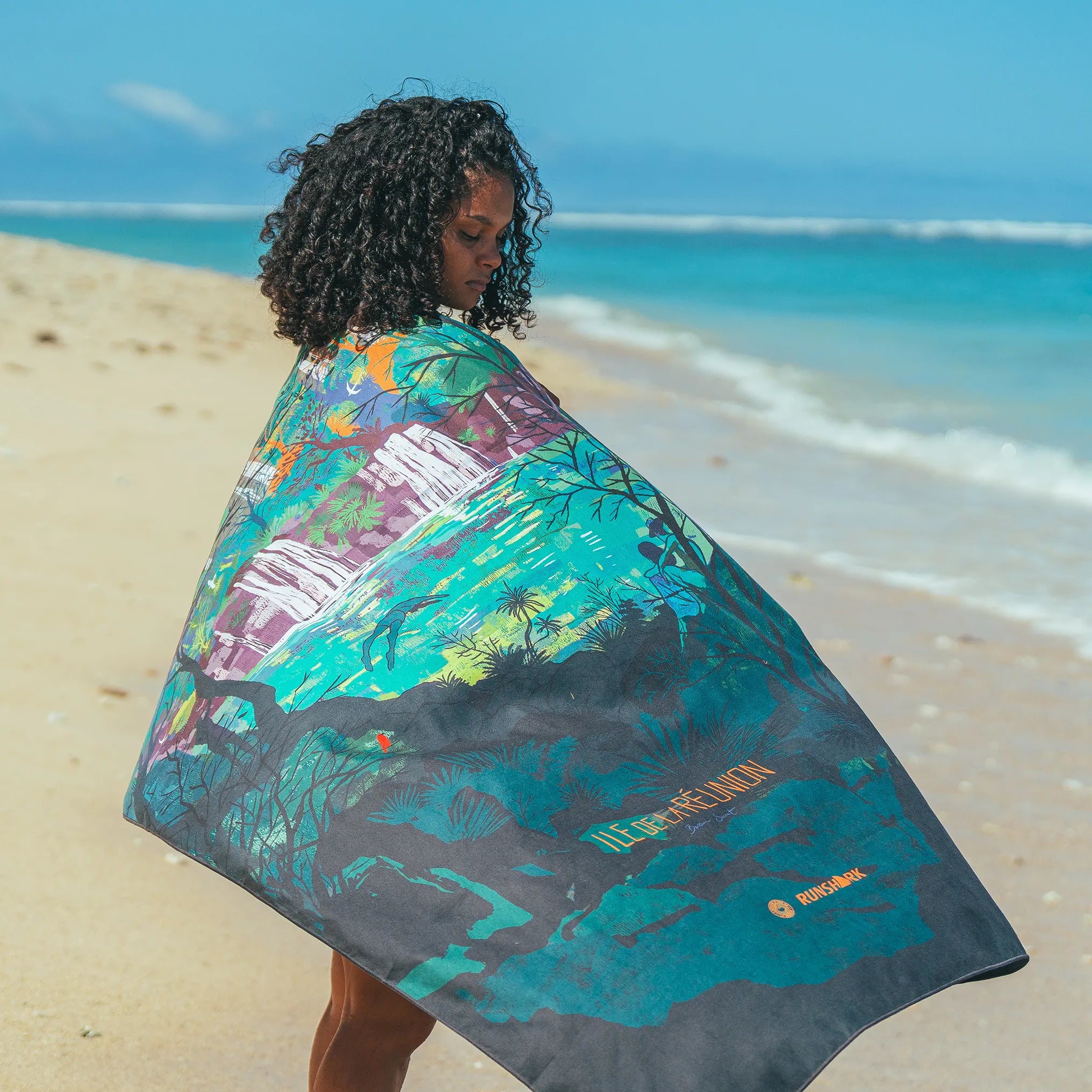 Né de l'imagination et du talent d'Hippolyte (L'Affiche d'une Ile), ce magnifique visuel est parfait sur cette serviette de plage.