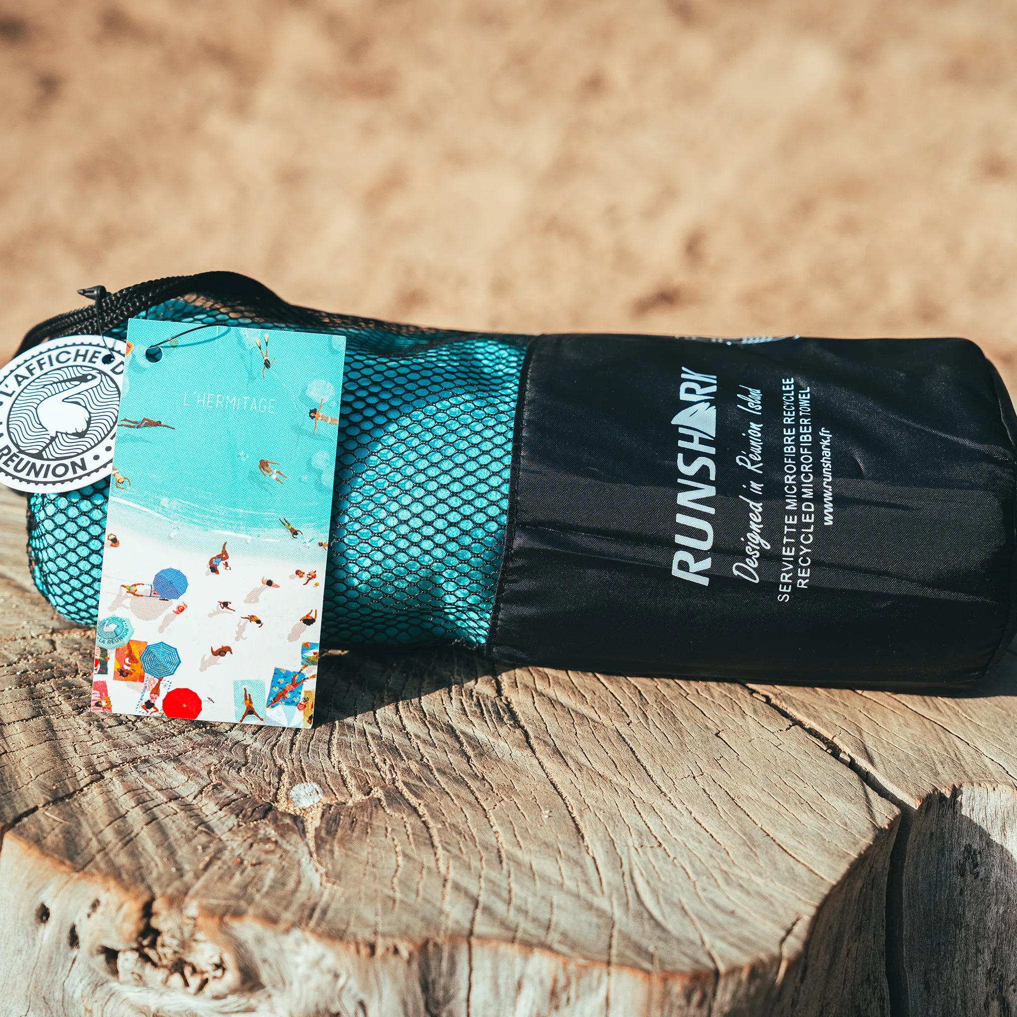 La jolie plage de sable blanc et le lagon turquoise de l'Hermitage vous rappelleront immanquablement vos vacances à La Réunion. Une serviette signée L'Affiche d'une Ile